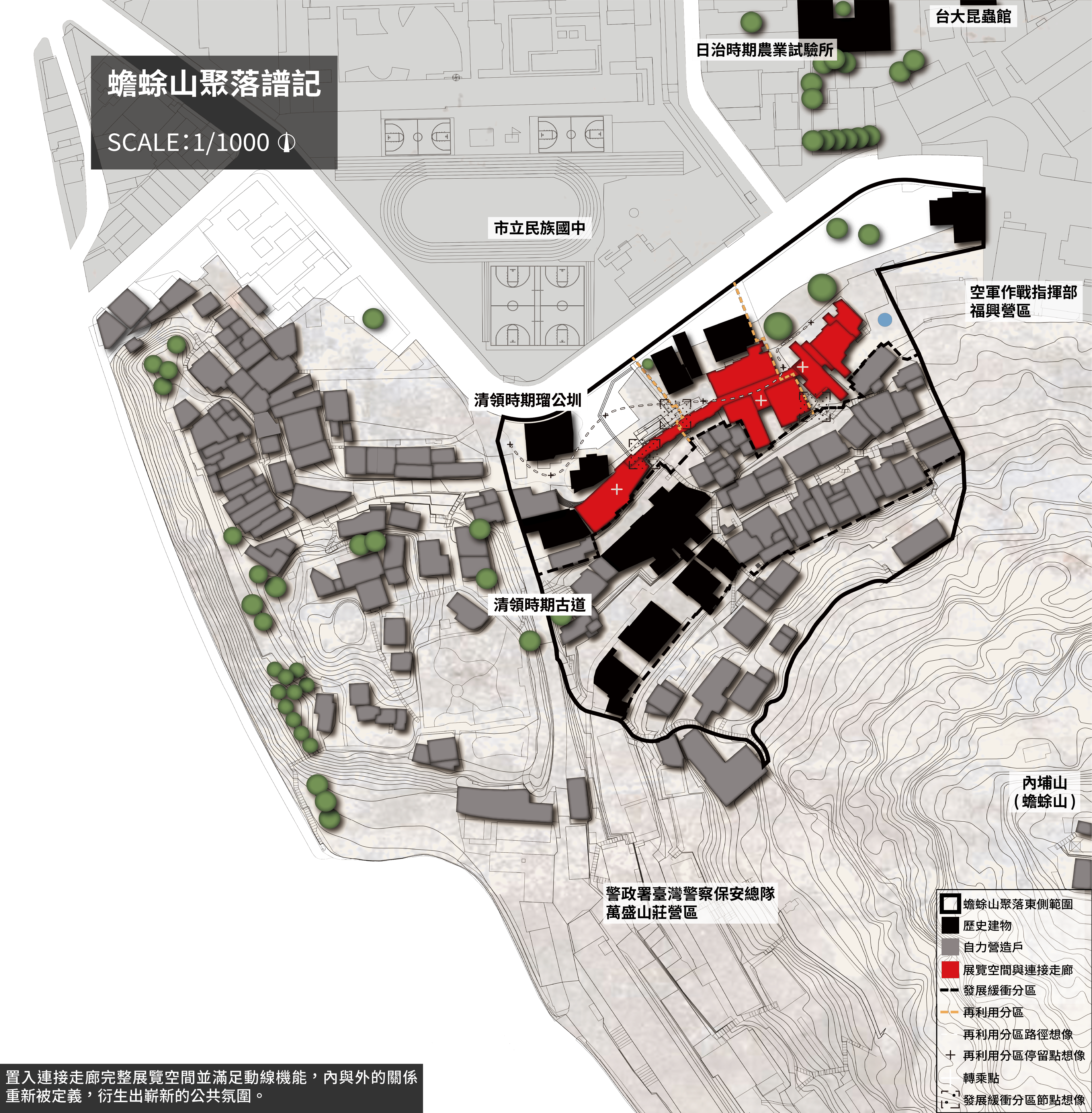 礎下,定義再利用分區「居民會所」、「微型群聚」、「精神文化中心」。並透過議題輔助